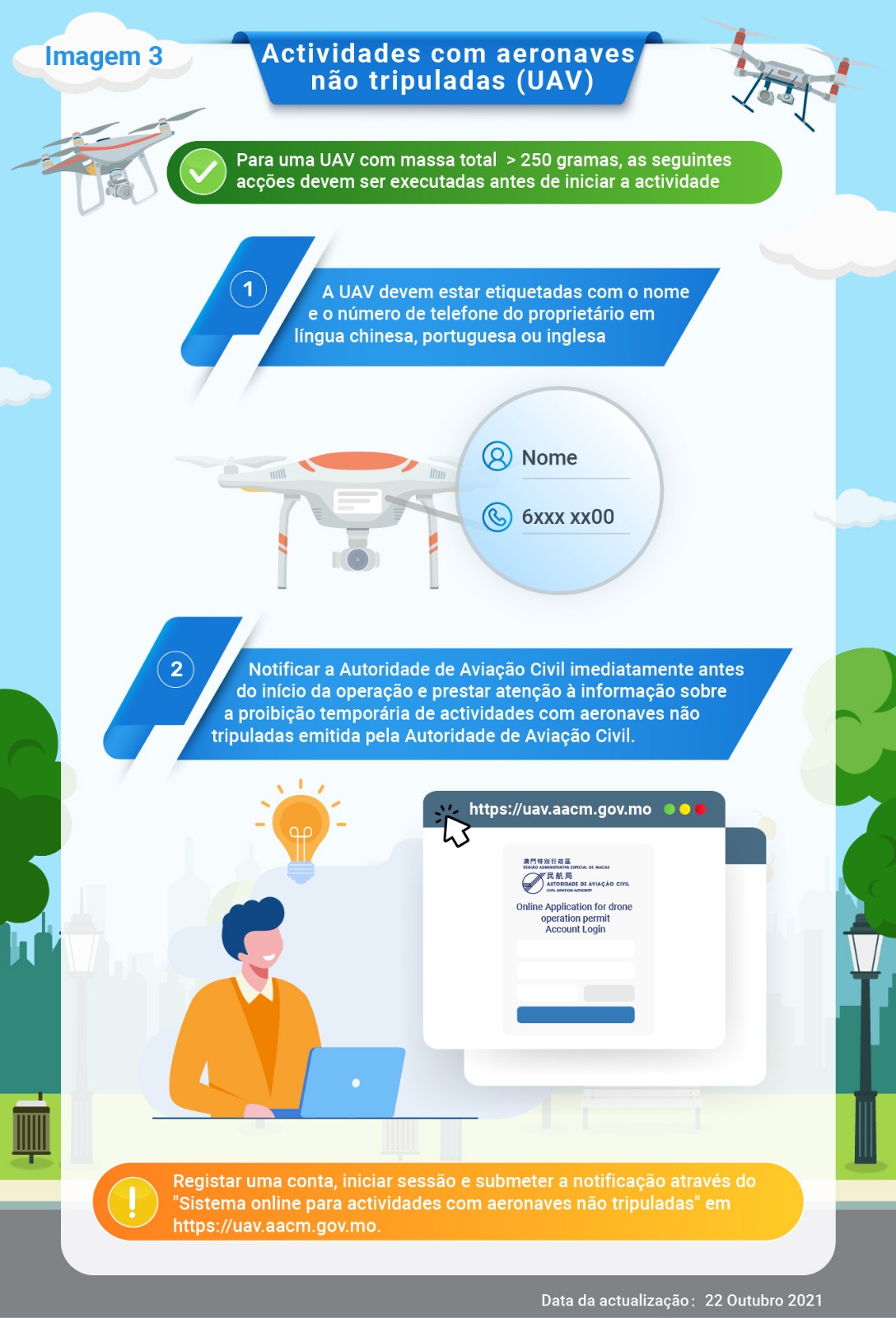 De acordo com o Regulamento de Navegação Aérea de Macau, aprovado pela Ordem Executiva n.º 43/2021, qualquer pessoa que deseje realizar actividades com aeronaves não tripuladas em Macau deve cumprir os requisitos e restrições relevantes. Por favor clique para ver o Regulamento de Navegação Aérea de Macau ou a tabela abaixo para uma melhor compreensão dos novos requisitos para as actividades com aeronaves não tripuladas.